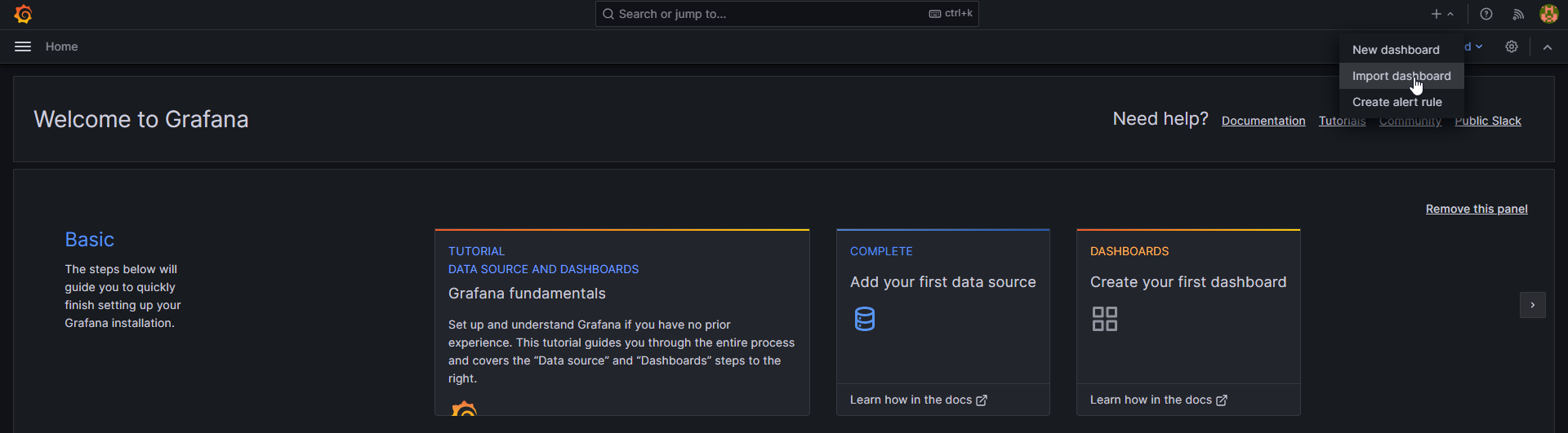 Navigate back to your home page, on the top right in the menu select Import dashboard