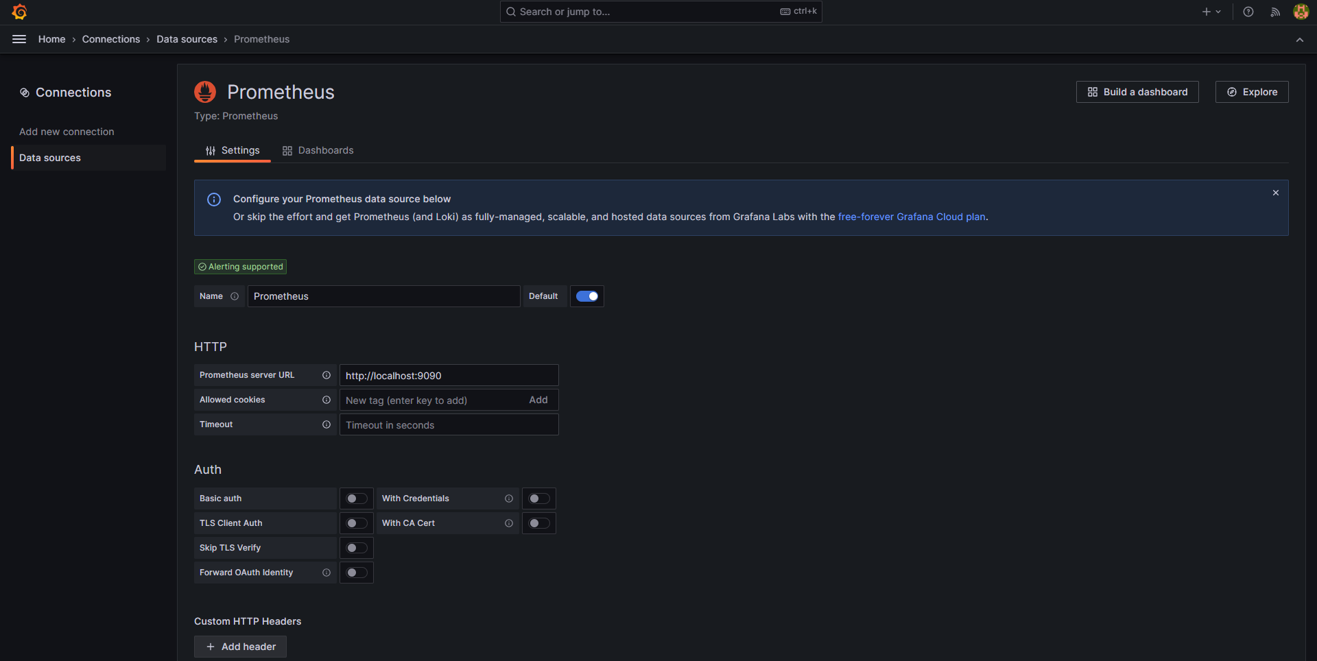 Set URL to “localhost:9090”, then test and save the connection