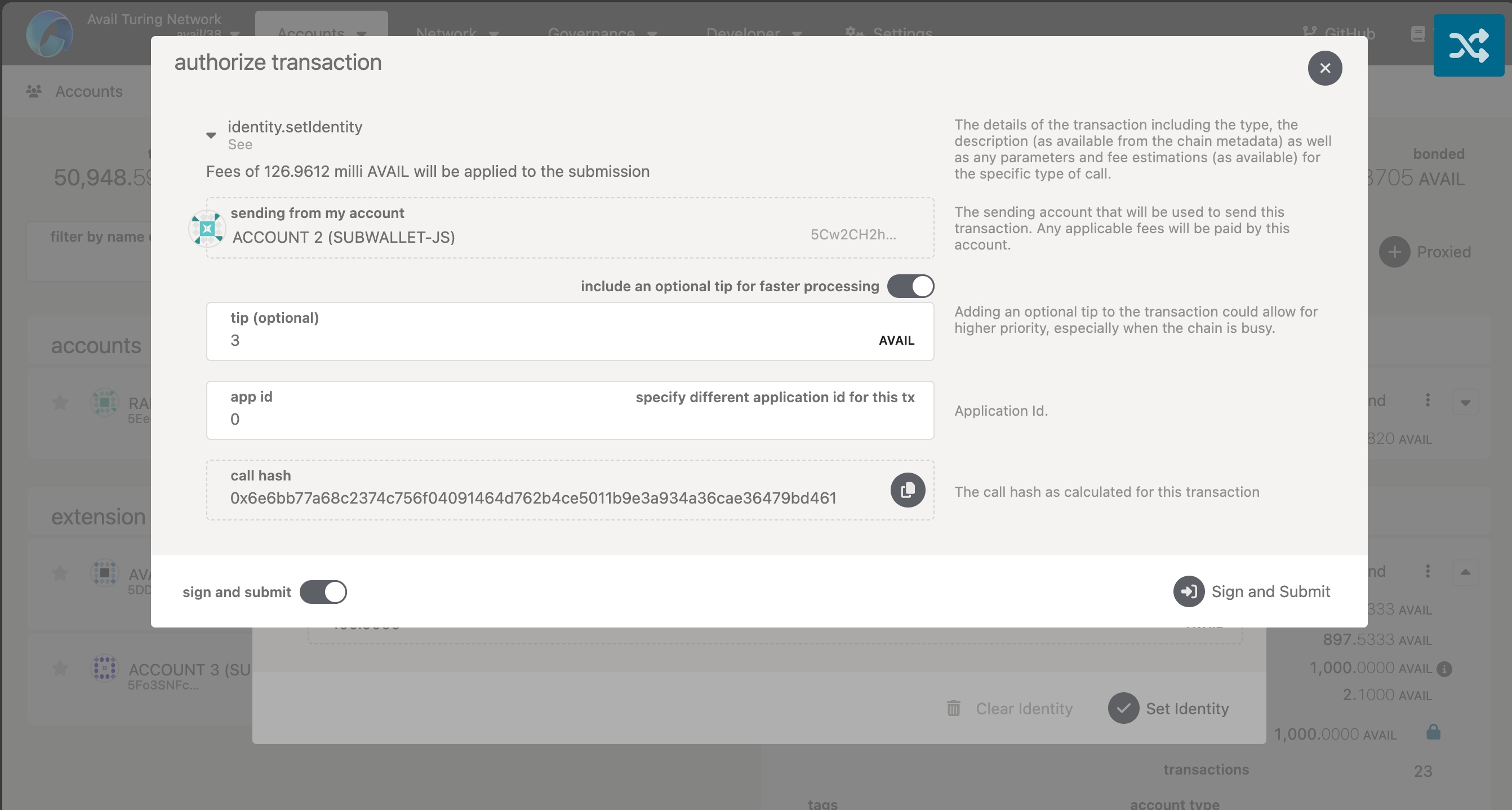 Avail allows you to set canonical on-chain identities for your accounts via the identity_setIdentity