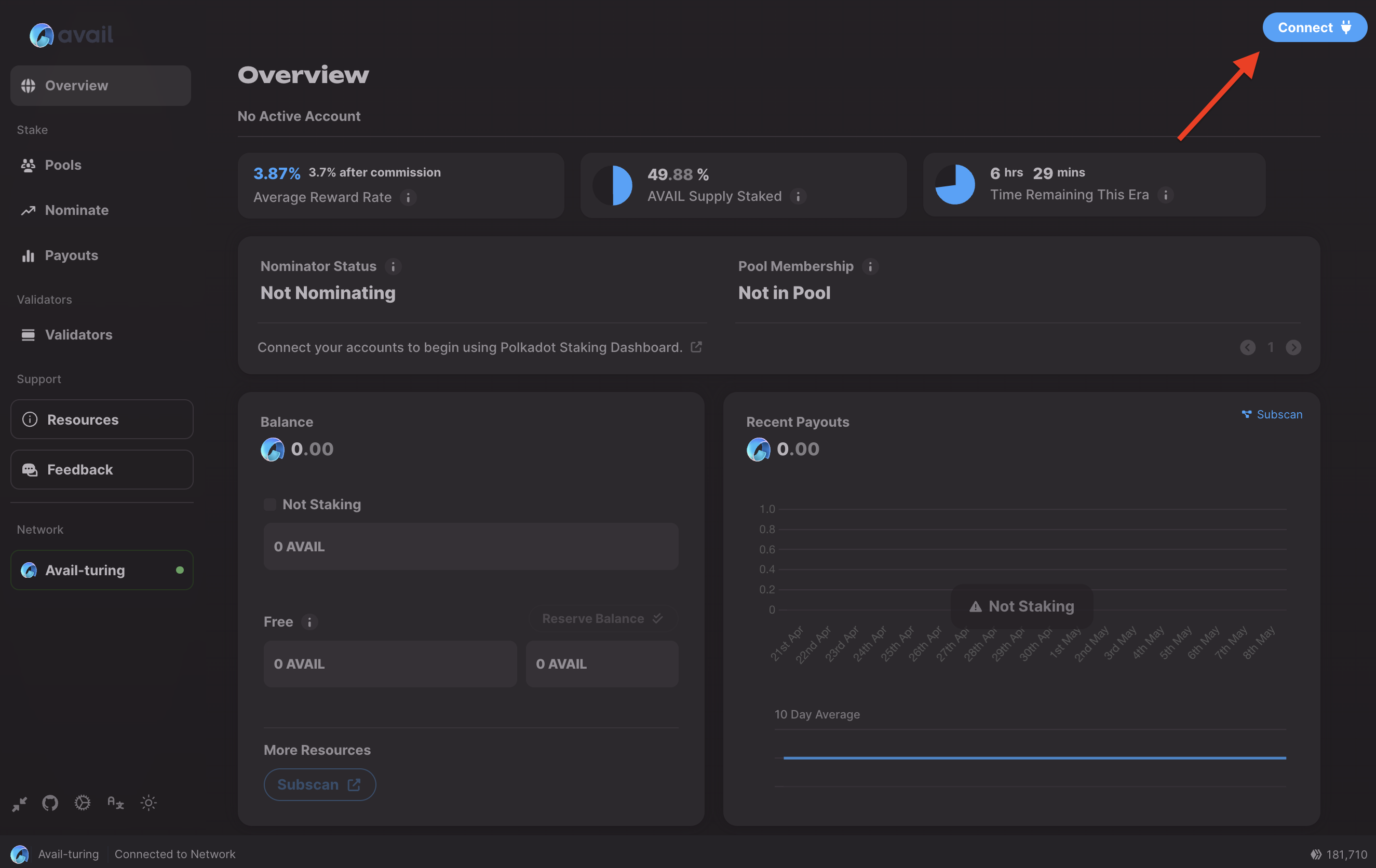 This is how the nominate page in the staking dashboard looks like, once you have connected a wallet.