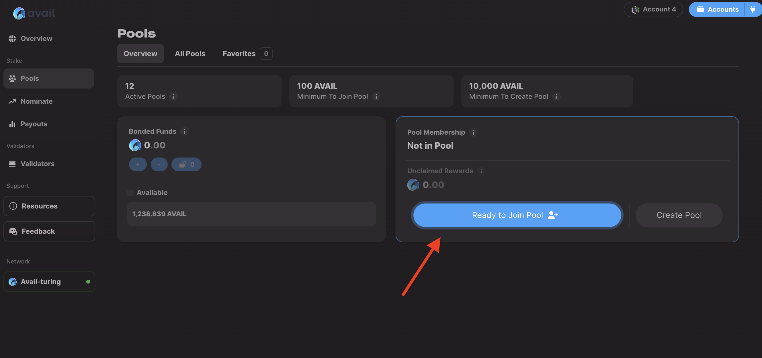 Once you have configured your settings, you can join the pool with any amount ≥ 100 AVAIL. Simply